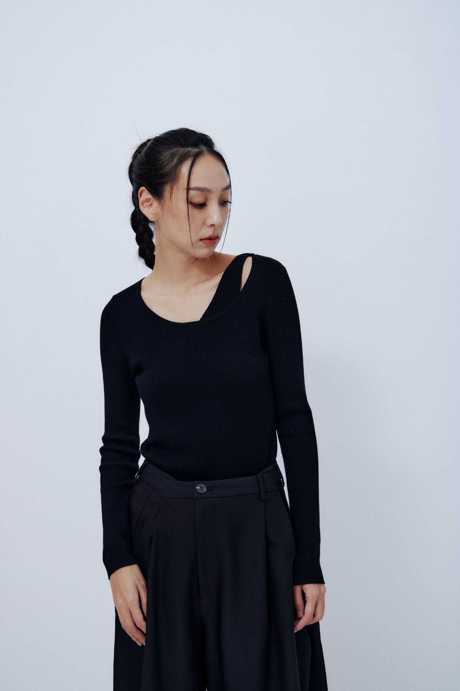 Fine knitted wool top with a playful design at the neck line. It can spice up your outfit by pairing with a blazer or simply a maxi for your evening look.