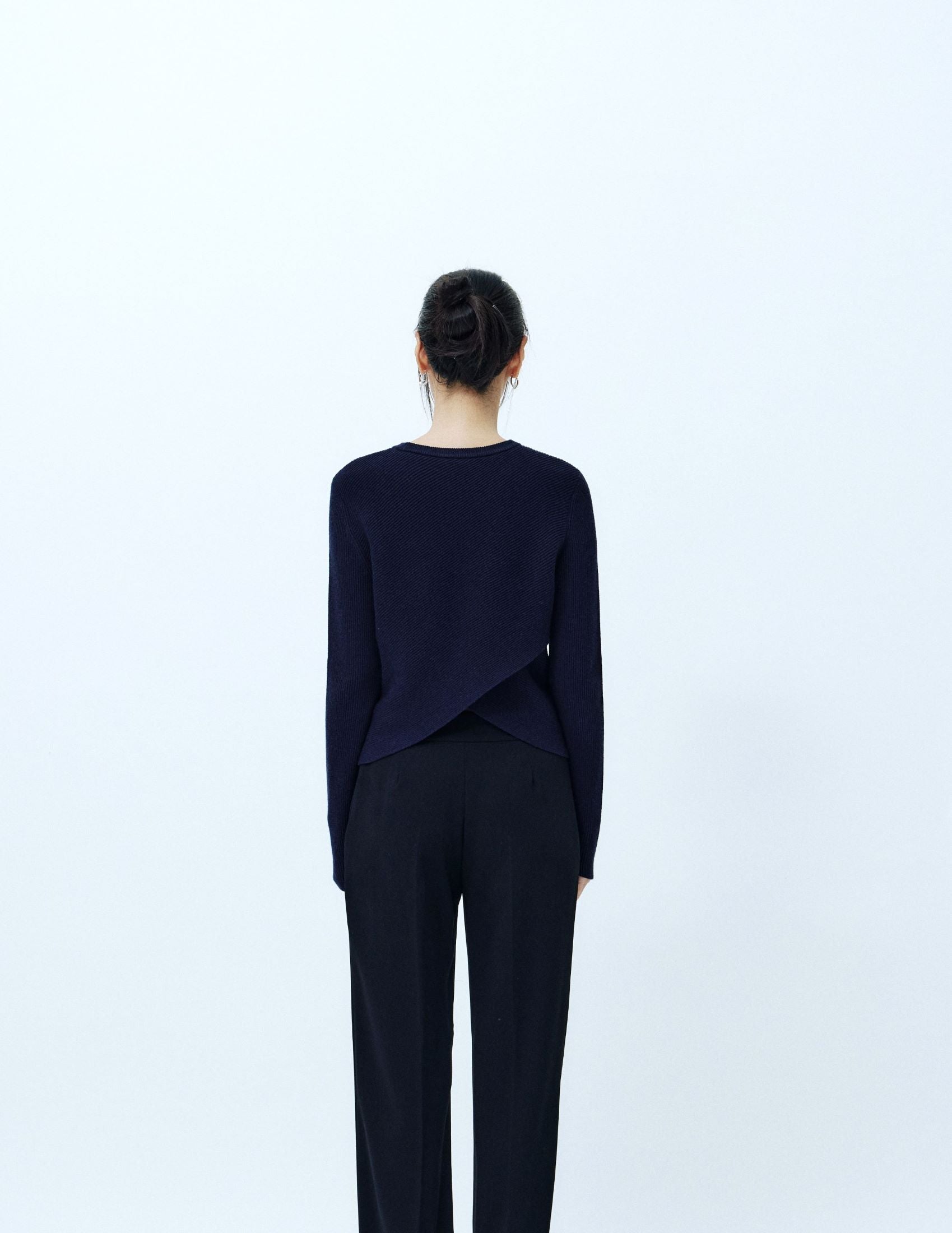 Welcome the autumn with this uplifting fine knitted top. Classic silhouette with a sleek overlapping design at the back. Cozy and soft, making this an essential piece for the upcoming season.