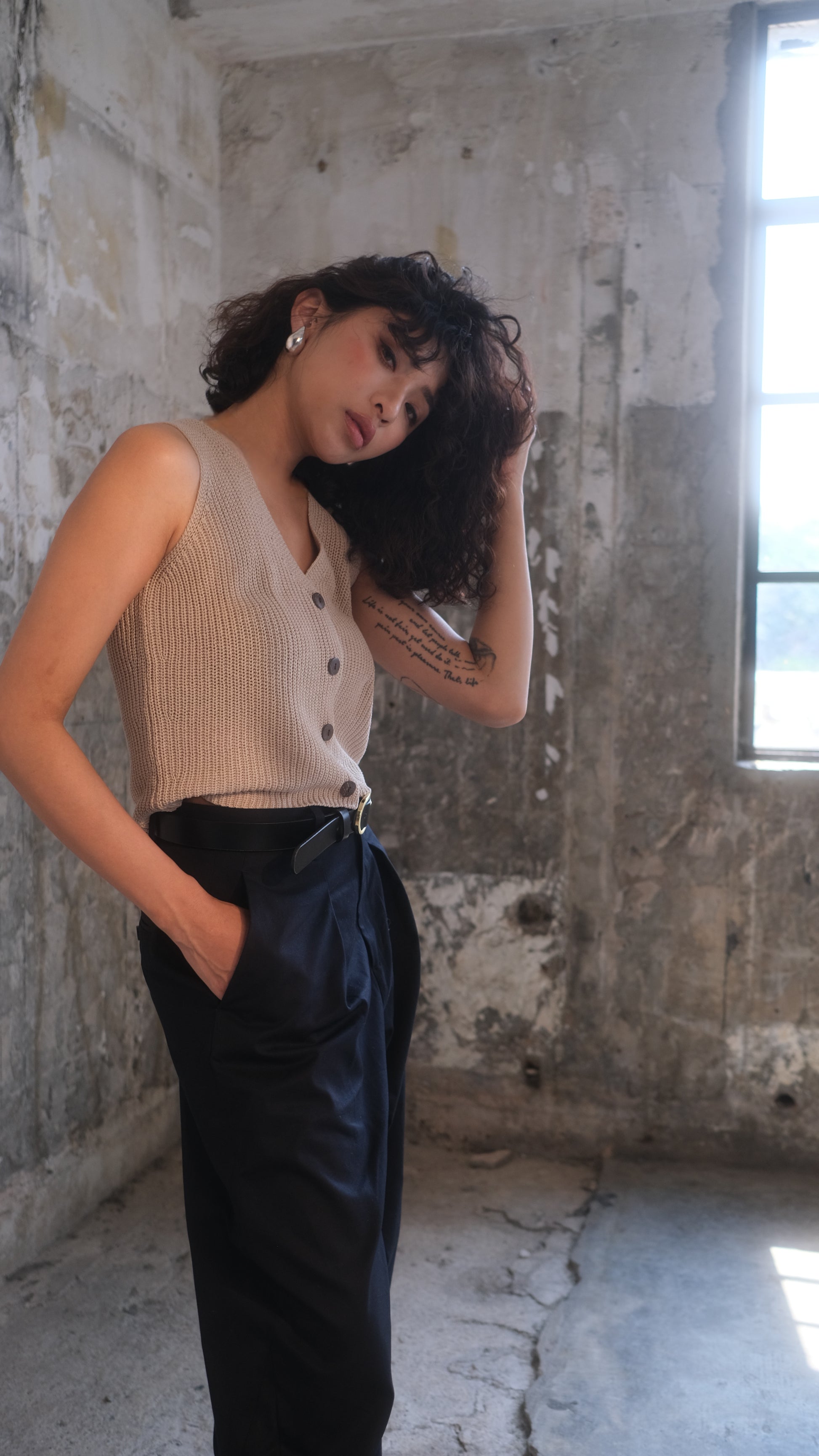 This sleeveless knit top features a v-neckline and small buttons which adds a classic touch. It can be worn with jeans for a relaxed and chic style, and it is perfect for layering or wearing alone, suitable for various occasions.