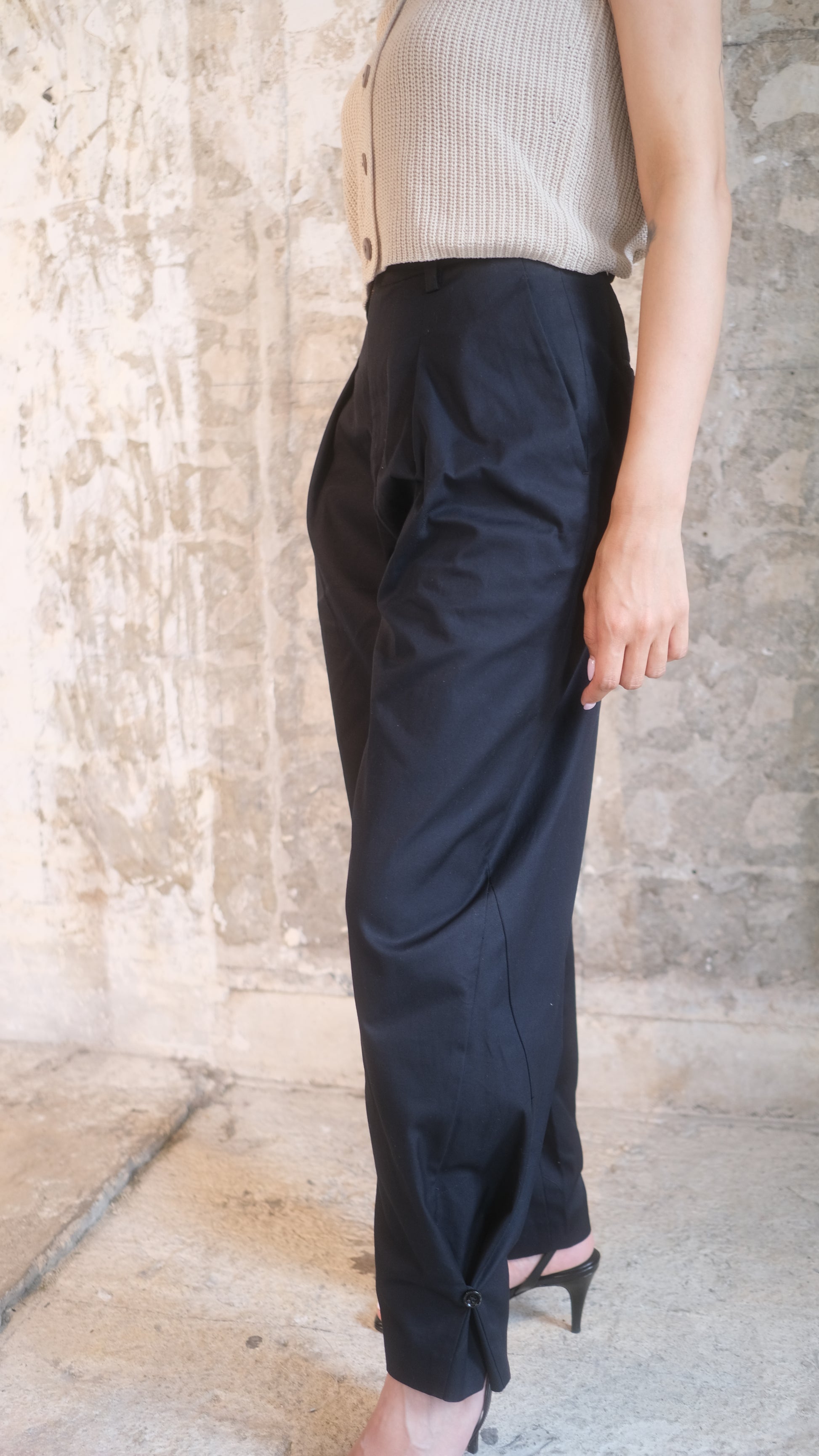 Our high-waisted trousers feature a unique detail at the bottom, allowing you to button them for a trendy barrel leg shape or unbutton them for a straight-leg fit, giving a relaxed yet stylish silhouette. Made from pure cotton, it has a high waistband with belt loops and convenient side pockets. These trousers are versatile and easy to style for both smart and casual outfits.